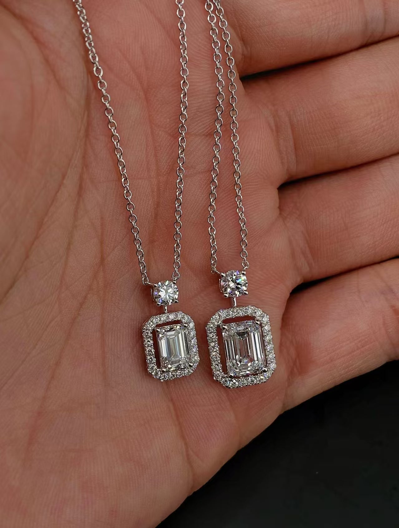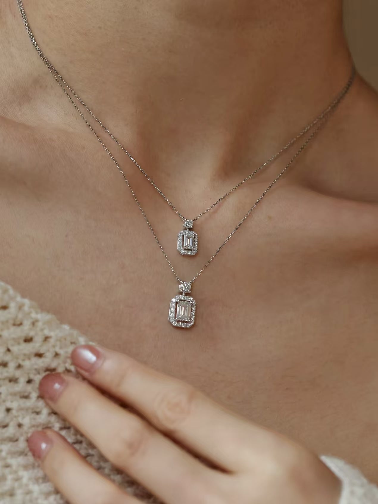 At the core of the piece is a center emerald-cut lab-grown diamond: Renowned for its elongated rectangular facets and crisp, mirror-like brilliance, this cut amplifies the stone’s clarity and luminous sparkle, catching light with every movement. As a lab-grown diamond, it boasts identical optical, physical, and chemical properties to natural diamonds—while being ethically sourced, environmentally sustainable, and remarkably accessible, without compromising on luxury.